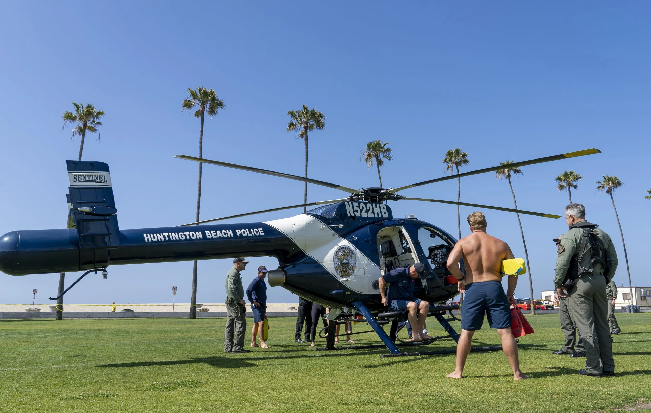 The guards trained with the Huntington Beach Police Department in getting dropped off from the helicopter in the event of an offshore rescue.